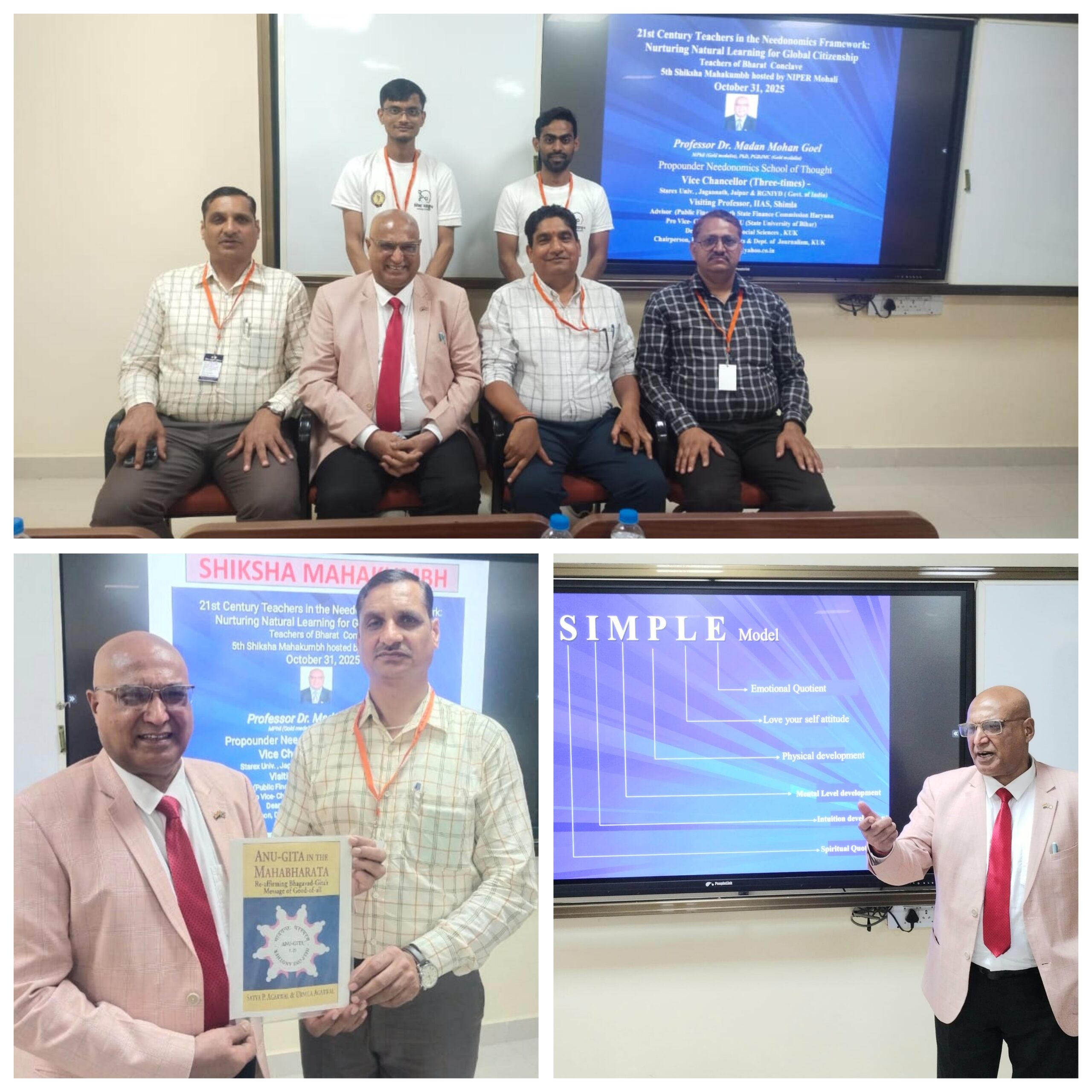 गीता से प्रेरित दर्शन “योगक्षेमं वहाम्यहम्” (आपका कल्याण हमारी जिम्मेदारी है) का उल्लेख करते हुए प्रो. गोयल ने शिक्षकों से आह्वान किया कि वे नीडो-टीचिंग अपनाएँ — जो आध्यात्मिकता और भौतिकता में संतुलन लाती है और विद्यार्थियों को “वसुधैव कुटुम्बकम्” (विश्व एक परिवार है) की भावना के अंतर्गत जिम्मेदार वैश्विक नागरिक बनाती है।