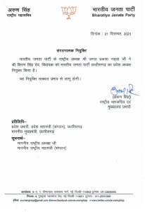 पार्टी के राष्ट्रीय महासचिव अरुण कुमार द्वारा जारी एक अधिसूचना में कहा गया है, “विधायक किरण सिंह देव को भाजपा के राष्ट्रीय अध्यक्ष जगत प्रकाश नड्डा ने भाजपा छत्तीसगढ़ इकाई का अध्यक्ष नियुक्त किया है। यह नियुक्ति तत्काल प्रभाव से लागू होगी।”