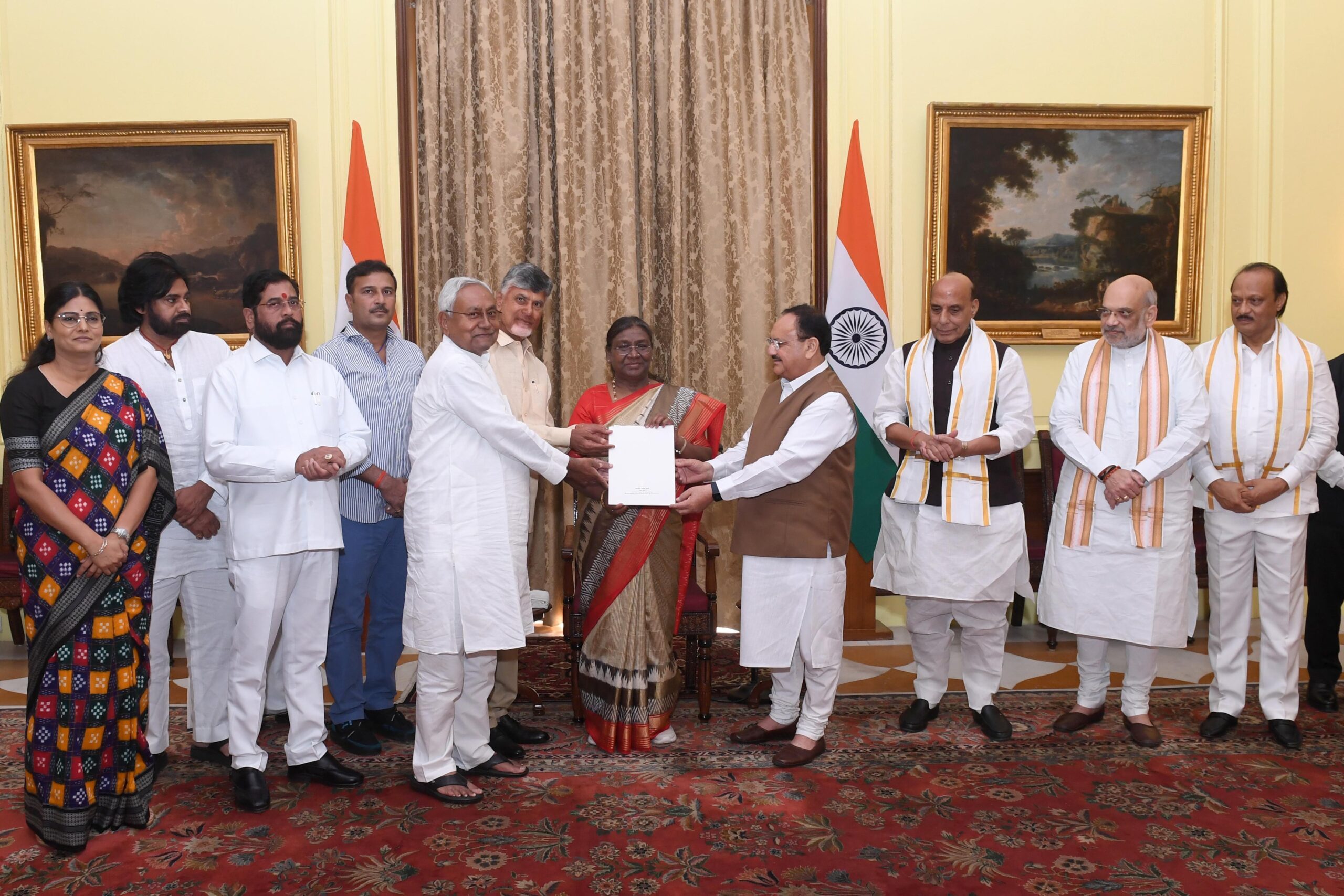 नई दिल्ली, 8जून। भारतीय जनता पार्टी (भाजपा) के अध्यक्ष जे.पी.नड्डा के नेतृत्व में राष्ट्रीय जनतांत्रिक गठबंधन (एनडीए) का एक प्रतिनिधिमंडल राष्ट्रपति भवन में राष्ट्रपति से मिला और उन्हें एक पत्र सौंपा। इस पत्र में यह कहा गया है कि नरेन्द्र मोदी को भाजपा संसदीय दल के नेता के रूप में चुना गया है। राष्ट्रपति को एनडीए के घटक दलों की ओर से समर्थन का पत्र भी सौंपा गया। प्रतिनिधिमंडल के अन्य सदस्यों में भाजपा से राजनाथ सिंह, अमित शाह, अश्विनी वैष्णव और डॉ. सी.एन. मंजूनाथ; तेलुगु देशम पार्टी से एन. चंद्रबाबू नायडू; जनता दल (यूनाइटेड) से नीतीश कुमार, राजीव रंजन सिंह (ललन सिंह) एवं संजय झा; शिव सेना से एकनाथ शिंदे; जनता दल (सेक्युलर) से एच.डी. कुमारस्वामी; लोक जनशक्ति पार्टी (रामविलास) से चिराग पासवान; हिंदुस्तानी अवाम मोर्चा (सेक्युलर) से जीतन राम मांझी; जनसेना से पवन कल्याण; राष्ट्रवादी कांग्रेस पार्टी से अजीत पवार; अपना दल (सोनीलाल) से अनुप्रिया पटेल; राष्ट्रीय लोक दल से जयंत चौधरी; यूनाइटेड पीपुल्स पार्टी लिबरल से जयंत बसुमतारी; असम गण परिषद से अतुल बोरा; सिक्किम क्रांतिकारी मोर्चा से इंद्र हैंग सुब्बा; ऑल झारखंड स्टूडेंट्स यूनियन से सुदेश महतो एवं चंद्र प्रकाश चौधरी; और रिपब्लिकन पार्टी ऑफ इंडिया (ए) से रामदास अठावले शामिल थे।