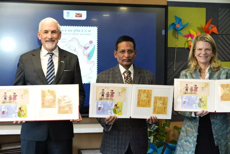 डाक विभाग संचार मंत्रालय, भारत सरकार और यूनिसेफ ने भारत में बच्चों के अधिकारों को साकार करने के लिए भारत के साथ यूनिसेफ की साझेदारी के 75 साल पूरे होने पर एक स्मारक डाक टिकट जारी किया।