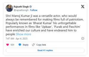 “मनोज कुमार जी का निधन अत्यंत दुखद है। उनकी फिल्में सिर्फ मनोरंजन नहीं, बल्कि देशभक्ति का जीवंत दस्तावेज़ थीं। भारतीय सिनेमा में उनका योगदान सदियों तक याद रखा जाएगा। ओम शांति।”