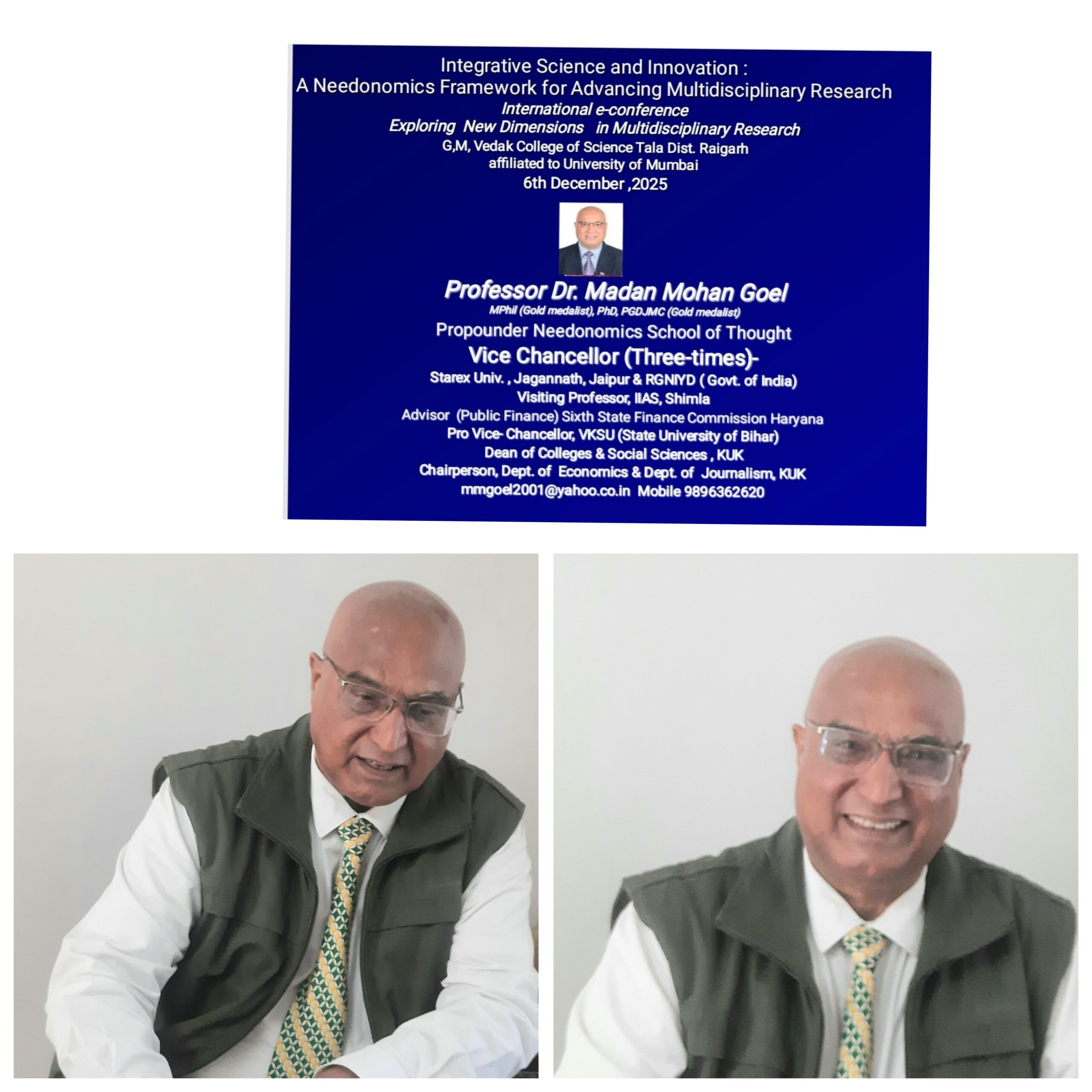 ताला (रायगढ़), 06 दिसम्बर: नीडोनॉमिक्स के प्रवर्तक, पूर्व तीन बार कुलपति और कुरुक्षेत्र विश्वविद्यालय के सेवानिवृत्त  प्रो. मदन मोहन गोयल ने आज जी.एम. वेदक कॉलेज ऑफ साइंस, ताला (मुंबई विश्वविद्यालय से संबद्ध)   ग्लोबल फाउंडेशन, इंडिया के सहयोग द्वारा आयोजित अंतरराष्ट्रीय ई-कॉन्फ्रेंस “बहुविषयक अनुसंधान में नए आयामों की खोज” को संबोधित किया।