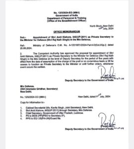 नई दिल्ली, 2जुलाई। IAS अमित किशोर को रक्षा मंत्री राजनाथ सिंह का निजी सचिव नियुक्त (private secretary) किया गया है. अमित किशोर UP कैडर के 2011 के बैच के IAS हैं. अमित किशोर को रक्षा मंत्री राजनाथ सिंह के निजी सचिव के रुप में नियुक्त करते हुए पत्र जारी किया गया है. जारी लेटर के मुताबिक पद संभालने की तारीख से पूरे कार्यकाल तक पांच साल की अवधि तक मंत्री के निजी सचिव के रूप में रहेंगे. यह लेटर उप कुल सचिव पूजा जैन की ओर से जारी किया गया है.