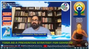 सांसद (राज्यसभा) राजीव चंद्रशेखर ने अपने विशेष संबोधन में कहा कि योग एक समुदाय के रूप में दुनिया को पूजनीय बनाने की हमारी संस्कृति के लोकाचार के साथ एक सुर में (वासुदेव कुटुंबकम) दुनिया को पिरोने के लिए भारत का उपहार है । कोविड जैसी महामाली ने यह बताया है कि कल्याण और स्वास्थ्य दुनिया भर में प्रमुख कारकों के रूप में उभर रहे हैं।