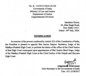नई दिल्ली, 5जुलाई। राष्ट्रपति द्रौपदी मुर्मू ने न्यायमूर्ति संजीव सचदेवा को मध्य प्रदेश उच्च न्यायालय का नया कार्यवाहक मुख्य न्यायाधीश नियुक्त किया है। गुरुवार को जारी आधिकारिक विज्ञप्ति के अनुसार।