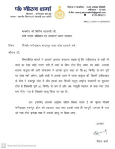 विधायक नीरज शर्मा ने माननीय नितिन गडकारी जी, सडक एंव परिवहन मंत्री भारत सरकार को 14 अप्रैल 2022 को पत्र लिखकर अनुरोध किया है कि फरीदाबाद के बीच में बदरपुर टोल है और इसके बाद दिल्ली मथुरा राष्ट्रीय राजमांर्ग पर तुमसरा टोल है जिसकी दूरी 60 किमी0 से कम है और अब गदपुरी पलवल के पास नया टोल बना दिया गया है जिसको बस चालू करना बाकि है। दिल्ली फरीदाबाद बादरपुर टोल को हटवाया जाए तथा इसके साथ ही गदपुरी पलवल के पास जो नया टोल बनाया गया है उसको चालू ना किया जाए।