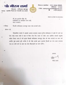 विधायक नीरज शर्मा ने राष्ट्रीय राजमार्ग की अध्यक्ष श्रीमति अल्का उपाध्याय जी, आई.एए.स से दिनांक 24 मार्च 2022 को दिल्ली उनके कार्यालय पर मुलाकत कर अवगत करवाया था कि फरीदाबाद से कही भी आने जाने का ऐसा कोई रास्ता नही है जहां से बिना टोल दिए आया-जाया जा सके। इसके साथ ही लोकसभा में माननीय नितिन गडकारी जी ने कहा की 60 किमी0 से कम दूरी पर टोल नही लगेगा, लेकिन दिल्ली फरीदाबाद के बीच में बदरपुर टोल है और इसके बाद दिल्ली मथुरा राष्ट्रीय राजमांर्ग पर तुमसरा टोल है जिसकी दूरी 60 किमी0 से कम है और अब गदपुरी पलवल के पास नया टोल बना दिया गया है जिसे चालू करना बाकि है।