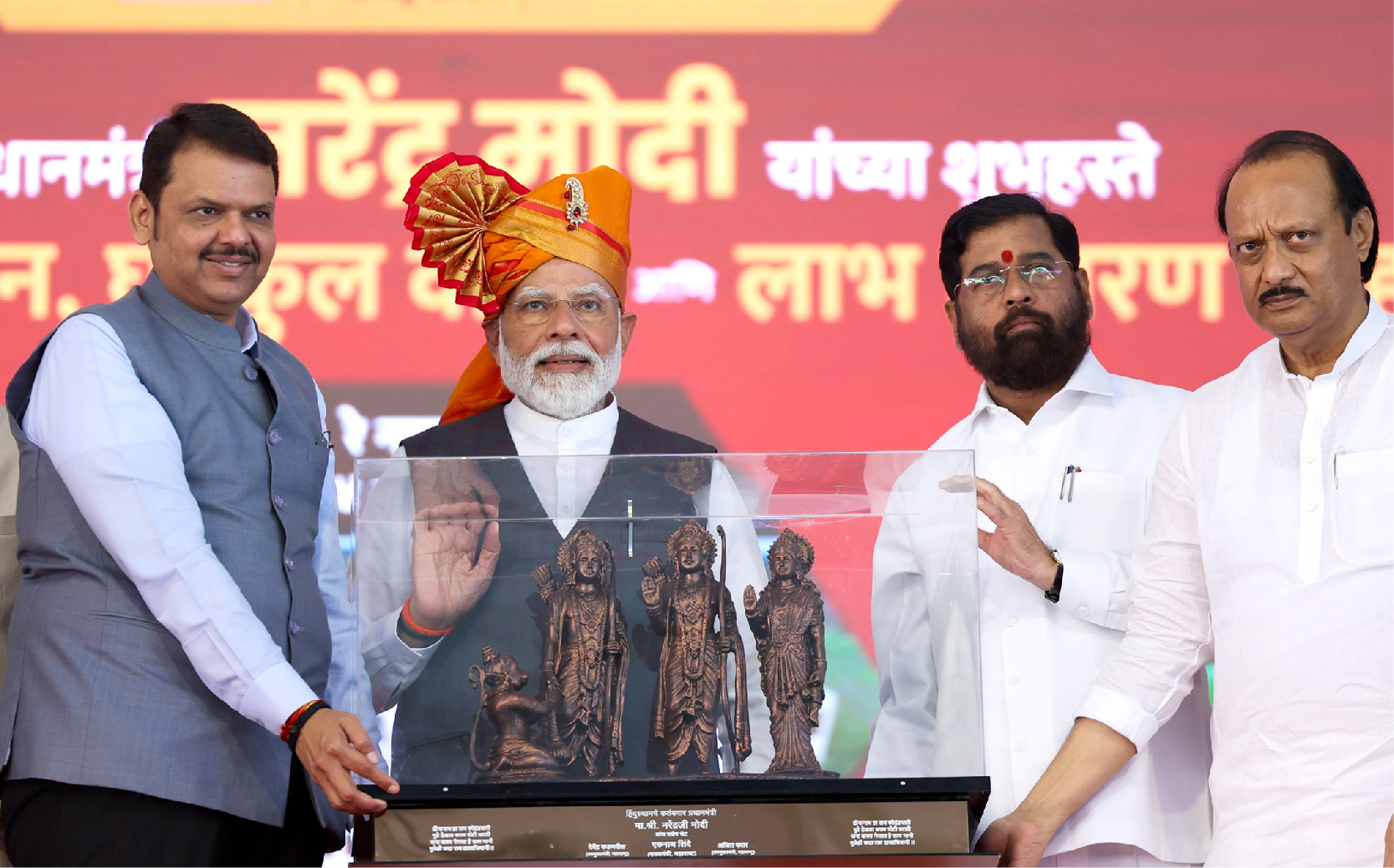 उपस्थित जनों को संबोधित करते हुए प्रधानमंत्री ने कहा कि 22 जनवरी को अयोध्या-धाम में राम मंदिर की प्राण प्रतिष्ठा पर संपूर्ण देशवासी भक्ति के रंग में सराबोर हैं। श्री मोदी ने कहा, “एक तंबू में भगवान राम के दर्शन की दशकों पुरानी पीड़ा अब दूर हो जाएगी।” उन्होंने कहा कि वह साधु-संतों के मार्गदर्शन में 11 दिवसीय अनुष्ठान के नियमों और विनियमों का पूरी निष्ठा एवं प्रतिबद्धता के साथ पालन कर रहे हैं और उन्होंने सभी नागरिकों के आशीर्वाद से श्री राम विग्रह की प्राण प्रतिष्ठा आयोजित करने का विश्वास व्यक्त किया। प्रधानमंत्री ने कहा कि उनका 11 दिवसीय विशेष अनुष्ठान महाराष्ट्र के नासिक में पंचवटी में शुरू हुआ था। उन्होंने प्रसन्नता व्यक्त की कि भक्ति की इस बेला में महाराष्ट्र के एक लाख से अधिक परिवार अपना गृह प्रवेश कर रहे हैं। उन्होंने कहा, “यह बहुत प्रसन्नता की बात है कि ये एक लाख परिवार 22 जनवरी की शाम को अपने पक्के घरों में राम ज्योति जलाएंगे।” प्रधानमंत्री नरेन्द्र मोदी के आग्रह पर लोगों ने अपने मोबाइल का फ्लैश ऑन कर राम ज्योति के संकल्प को प्रदर्शित किया।