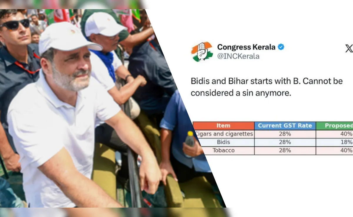 पटना, 5 सितंबर: कांग्रेस की केरल इकाई ने केंद्र सरकार के वस्तु एवं सेवा कर (जीएसटी) सुधारों को लेकर एक विवादास्पद सोशल मीडिया पोस्ट साझा किया। इस पोस्ट में तंबाकू उत्पादों पर जीएसटी दरों में कटौती का जिक्र करते हुए लिखा गया कि “बीड़ी और बिहार दोनों का नाम ‘बी’ से शुरू होता है।”